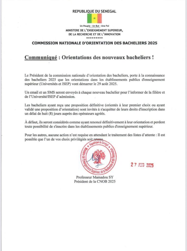 Les orientations des nouveaux bacheliers vers les universités et ISEP publics débuteront le 29 août 2025. Chaque étudiant recevra par email et SMS sa filière et son établissement d’admission. Ceux ayant une proposition définitive doivent s’acquitter de leurs droits d’inscription dans un délai de huit jours, sous peine de perdre leur place, tandis que les autres attendront le traitement des listes d’attente.