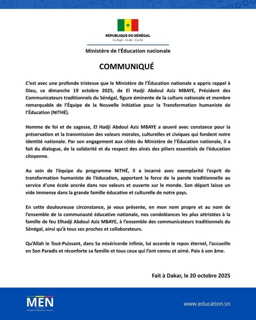 Le ministère de l’Éducation nationale a exprimé sa profonde tristesse après le rappel à Dieu, ce dimanche 19 octobre 2025, d’El Hadji Abdoul Aziz Mbaye, président des communicateurs traditionnels du Sénégal et membre du programme NITHÉ. Homme de foi, de parole et de valeurs, il laisse derrière lui un héritage moral et culturel précieux pour la nation et pour l’école sénégalaise.