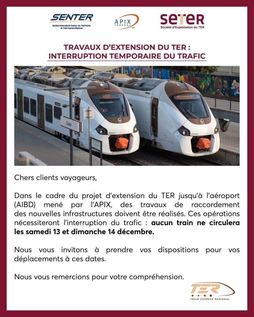 Dans le cadre de l’extension du TER vers l’aéroport AIBD, l’APIX annonce des travaux de raccordement nécessitant l’arrêt complet de la circulation ferroviaire. Aucun train ne circulera durant le week-end des 13 et 14 décembre, invitant les voyageurs à anticiper leurs déplacements.