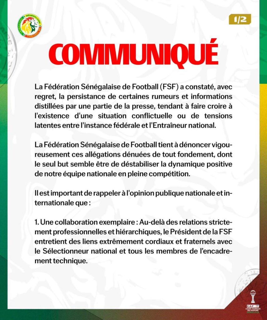 Face à la persistance de rumeurs évoquant des tensions entre l’instance fédérale et le sélectionneur national, la Fédération Sénégalaise de Football est sortie de son silence. Dans un communiqué officiel publié à Tanger, la FSF rejette fermement ces allégations, réaffirme la parfaite collaboration au sein de l’encadrement et invite le peuple sénégalais à la mobilisation et à l’unité totale derrière les Lions en quête d’un nouveau sacre continental.