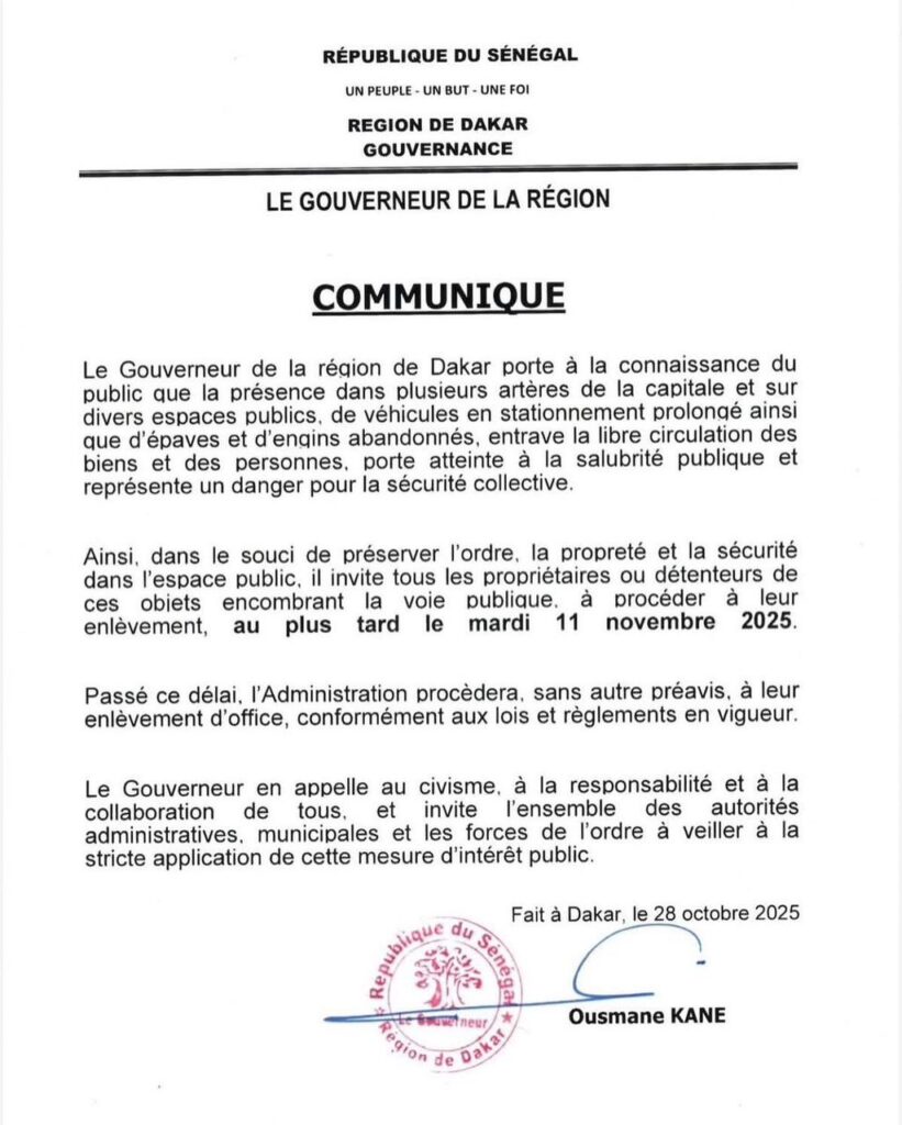 Le Gouverneur de la région de Dakar, Ousmane Kane, a annoncé dans un communiqué que tous les véhicules en stationnement prolongé, épaves et objets encombrants présents dans les rues et espaces publics devront être enlevés au plus tard le mardi 11 novembre 2025. Cette mesure vise à préserver l’ordre, la sécurité et la salubrité publique. Passé ce délai, l’administration procédera à leur enlèvement d’office, en conformité avec la loi, et appelle les citoyens au civisme et à la responsabilité.