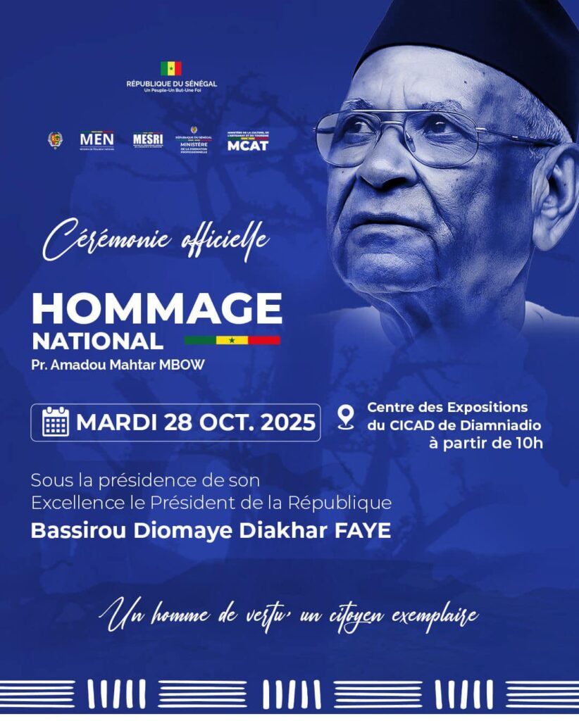 Le président de la République, Bassirou Diomaye Faye, a convié la Nation à un hommage solennel en mémoire du Pr Amadou Mahtar Mbow, figure emblématique du savoir et de la citoyenneté. La cérémonie se tiendra le 28 octobre 2025 au Centre international de Conférence Abdou Diouf (CICAD). Le ministre de l’Éducation nationale appelle les Sénégalais à se rassembler dans un élan de reconnaissance pour honorer la vie et l’œuvre de cet illustre serviteur de la patrie.