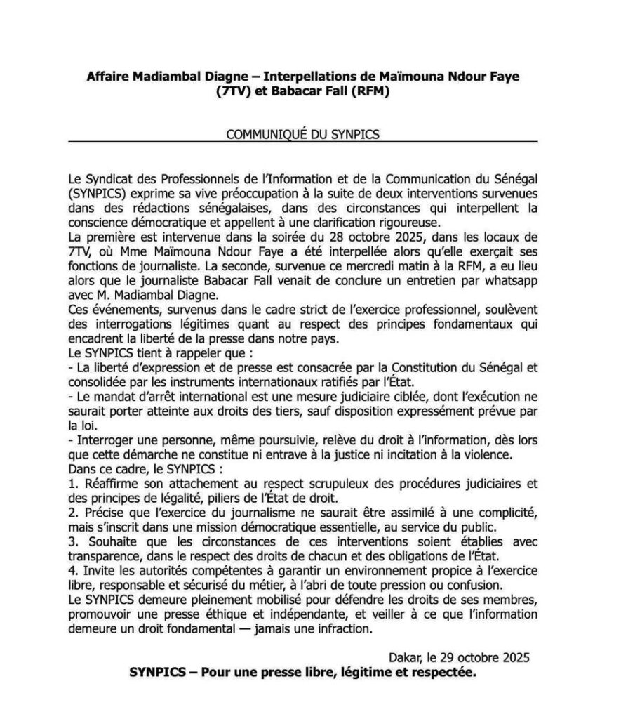 À la suite des arrestations de la journaliste Maïmouna Ndour Faye (7TV) et de Babacar Fall (RFM), le Syndicat des professionnels de l’information et de la communication du Sénégal (Synpics) a exprimé sa vive préoccupation. Dans un communiqué publié ce 29 octobre, il rappelle que ces interpellations, survenues dans l’exercice de leurs fonctions, posent de sérieuses questions sur le respect des principes fondamentaux encadrant la liberté de la presse au Sénégal.