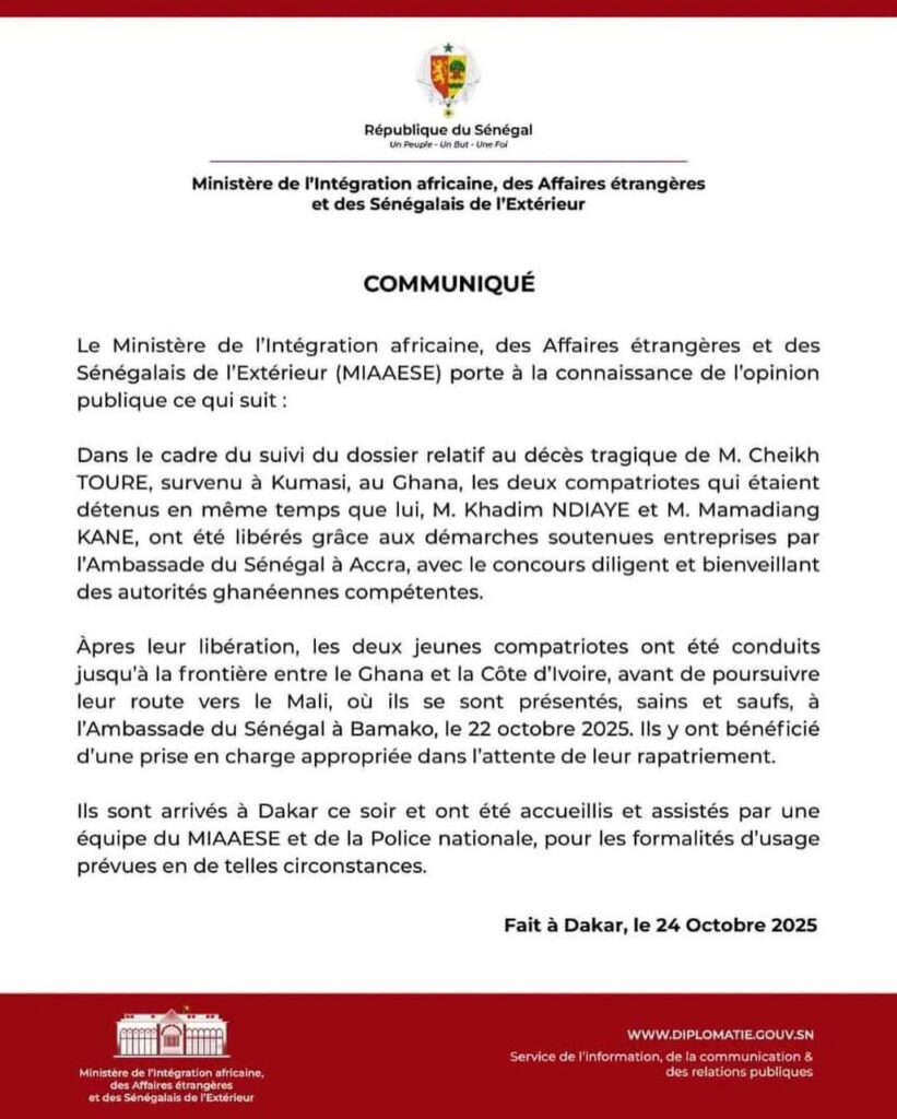 Le ministère de l’Intégration africaine, des Affaires étrangères et des Sénégalais de l’extérieur a annoncé la libération de deux compatriotes détenus au Ghana en même temps que feu Cheikh Touré. Grâce aux démarches de l’ambassade du Sénégal à Accra et à la coopération des autorités ghanéennes, ils ont été rapatriés sains et saufs à Dakar.
