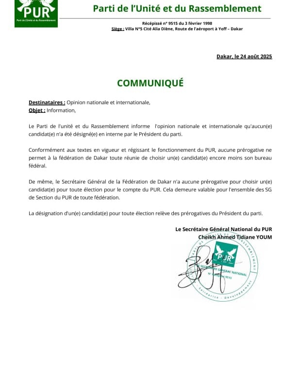 Le Parti de l’Unité et du Rassemblement (PUR) a tenu à clarifier, ce 24 août 2025, qu’aucun candidat n’a encore été désigné pour les prochaines élections.