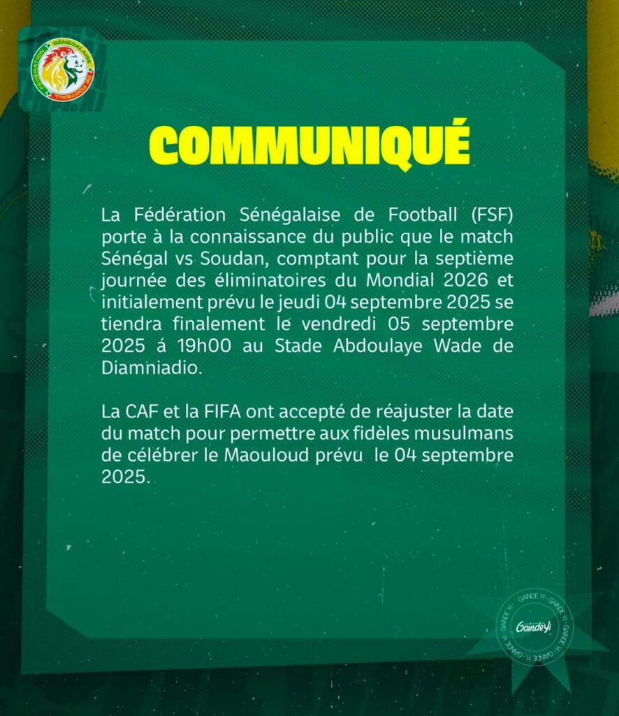 La Fédération Sénégalaise de Football (FSF) a annoncé le report du match Sénégal-Soudan, comptant pour la 7ᵉ journée des éliminatoires du Mondial 2026. Initialement prévu le 4 septembre, le match se jouera finalement le vendredi 5 septembre 2025 à 19h au Stade Abdoulaye Wade de Diamniadio, afin de permettre la célébration du Maouloud par les fidèles musulmans.
