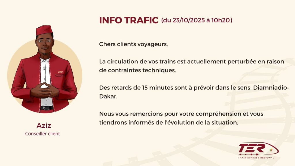 Le Train Express Régional (TER) a annoncé ce jeudi 23 octobre 2025 une perturbation temporaire du trafic en raison de contraintes techniques. Des retards estimés à environ 15 minutes sont à prévoir dans le sens Diamniadio–Dakar. La direction du TER a présenté ses excuses aux voyageurs et assure suivre de près l’évolution de la situation.