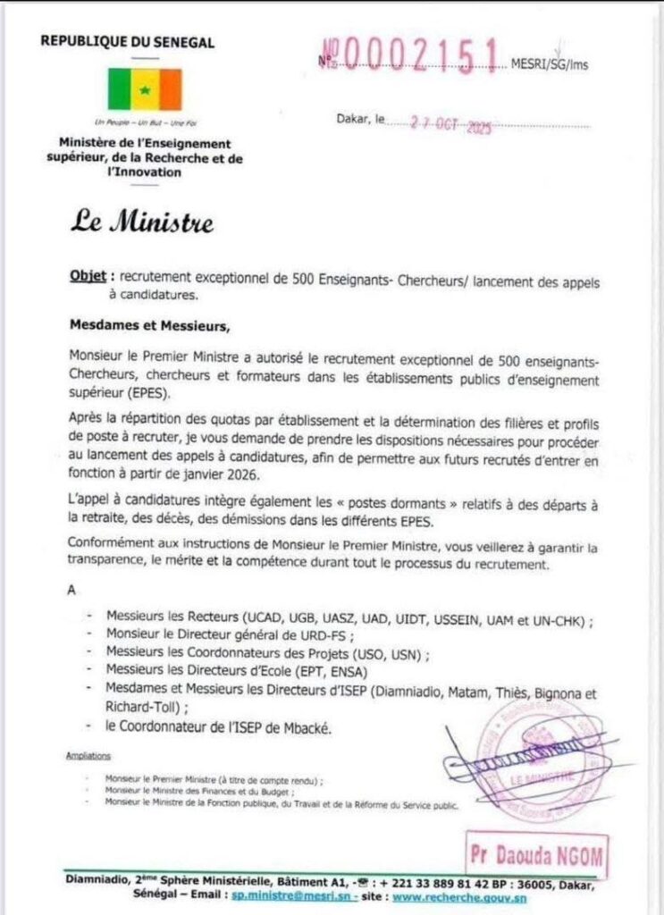 Le ministre de l’Enseignement supérieur, de la Recherche et de l’Innovation, Pr Daouda Ngom, a annoncé l’autorisation donnée par le Premier ministre pour le recrutement exceptionnel de 500 enseignants-chercheurs et formateurs. Cette initiative vise à renforcer les effectifs dans les établissements publics d’enseignement supérieur dès janvier 2026, en tenant compte des postes vacants liés aux départs à la retraite, décès ou démissions.