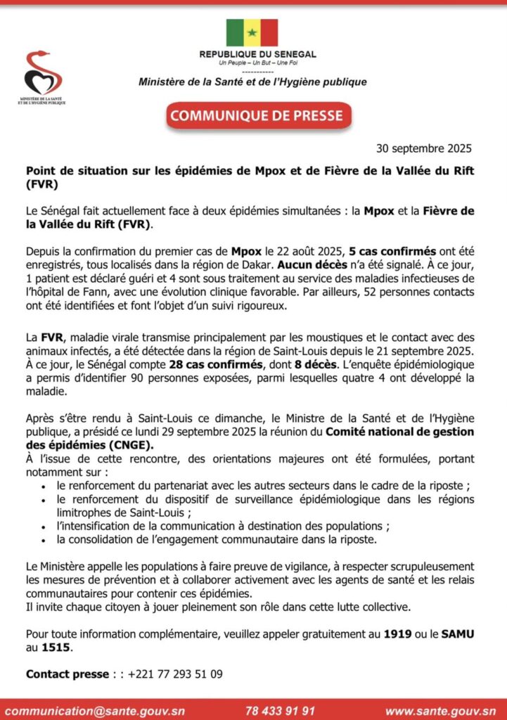 Le Sénégal fait face à deux épidémies simultanées : la variole du singe (Mpox) et la fièvre de la Vallée du Rift (FVR). À ce jour, 5 cas de Mpox ont été confirmés à Dakar sans aucun décès, tandis que la région de Saint-Louis enregistre 28 cas de FVR dont 8 mortels. Les autorités sanitaires appellent à la vigilance et renforcent les dispositifs de surveillance et de riposte.