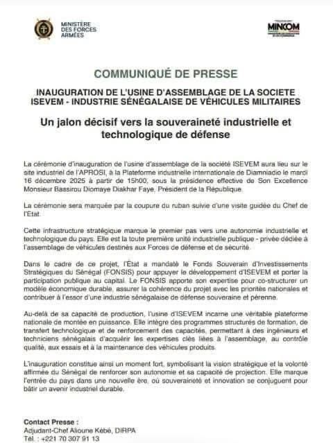 Le président de la République, Bassirou Diomaye Faye, va présidé l’inauguration de l’usine d’assemblage de la société ISEVEM, marquant une étape majeure dans la stratégie de souveraineté industrielle et technologique du Sénégal. Cette infrastructure, dédiée à l’assemblage de véhicules militaires et de sécurité, symbolise la volonté de l’État de renforcer son autonomie en matière de défense et de développement industriel durable.