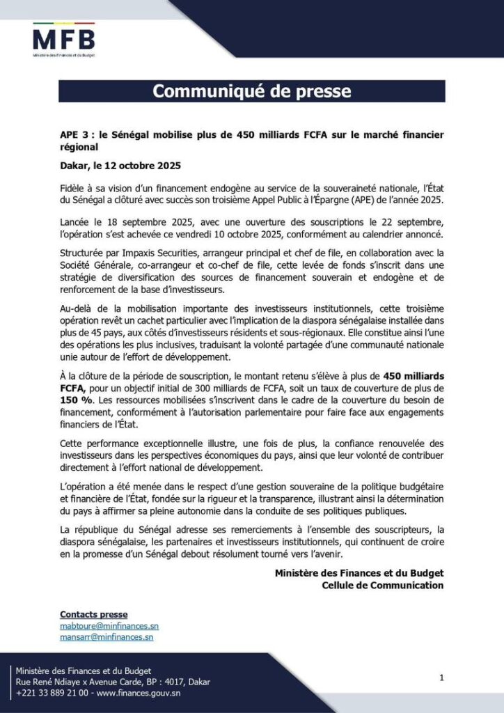 L’État du Sénégal a bouclé avec succès son troisième Appel Public à l’Épargne (APE) de l’année 2025, mobilisant plus de 450 milliards FCFA sur un objectif initial de 300 milliards. Cette opération, marquée par une forte participation des investisseurs nationaux et de la diaspora, traduit la confiance renouvelée dans la solidité économique du pays et la pertinence de sa stratégie de financement endogène.