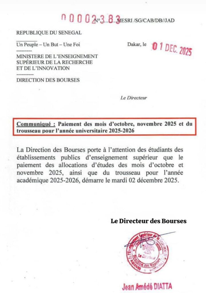 La Direction des Bourses a annoncé le lancement, à partir du mardi 2 décembre 2025, du paiement des allocations d’études des mois d’octobre et novembre, ainsi que du trousseau pour l’année universitaire 2025-2026. Cette décision concerne l’ensemble des étudiants des établissements publics d’enseignement supérieur.